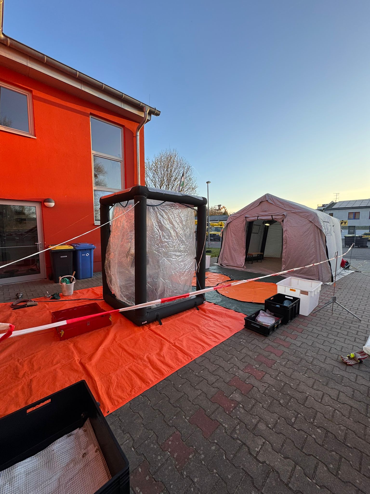 Dazu ein Bild unsere auf dem AB-Gefahrgut verlasteten Dusche, sowie dem Auskleidebereich und dem ebenfalls verlasteten Zelt in dem sich die Trupps wieder nach dem Ausziehen der CSAs umziehen können.